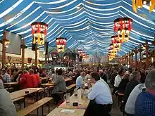 Beer halls are a traditional part of Bavarian culture, and feature prominently in Oktoberfest.[1] Bosch notes that the beer halls of Oktoberfest, known in German as Festzelte, are more properly termed "beer tents", as they are large, temporary structures built in the open air.[2] In Munich alone, the Festzelte of Oktoberfest can accommodate over 100,000 people.[2]
