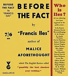 Before the Fact (1932) is an English novel by Anthony Berkeley Cox writing under the pen name "Francis Iles". It tells the story of a woman marrying a man who is after her inherited money and prepared, it seems, to kill her for it. Whether he does succeed in the end, or whether she has been imagining his plots, is left unclear. Together with the previous Iles book Malice Aforethought (1931), it can be placed in the category of psychological suspense novel. Elements of the story were used for the 1941 American film Suspicion, directed by Alfred Hitchcock.