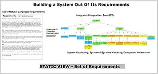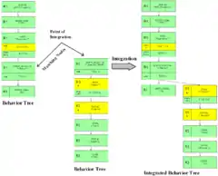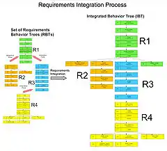 - Integrated behavior trees: Because a set of requirements imply the integrated behavior of a system, all the individual requirement behavior trees can be composed to construct an integrated behavior tree (IBT) that provides a single holistic view of the emergent integrated behavior of the system. This enables the building of the integrated behavior of a system out of its requirements.[8] An analogy to help describe this process is the transition from a randomly arranged set of jigsaw puzzle pieces to putting each of the pieces in its appropriate place. When we do this, we see each piece of information in its intended context and we see the pieces of information as a whole and the emergent properties of the whole.