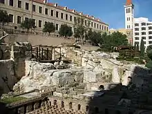 - Third Route: This segment of the pedestrian circuit revolves largely around the "Roman Baths Garden" and the Grand Serail. The Roman Baths Garden at the base of the Serail Hill exhibits brick vaults, remains of ventilation networks, old water heating apparatuses, bathing areas among other archaeological remains from the bathhouse. The route also passes by terraced gardens, fountains, Olive and Pine groves, a small amphitheatre, leading all the way up to the hilltop where the route terminates at the Grand Serail, Hamidiyi Clock-tower, Council of Reconstruction and Development, and the St. Louis Capuchin crusader church.[12]