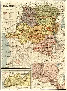 The territorial service was the true backbone of the colonial administration.[25] The colony was divided into four provinces (six after the administrative reforms of 1933). Each province was in turn divided into a few districts (24 districts for the whole Congo) and each district into a handful of territories (some 130–150 territories in all; some territories were merged or split over time).[26] A territory was managed by a territorial administrator, assisted by one or more assistants. The territories were further subdivided into numerous "chiefdoms" (chefferies), at the head of which the Belgian administration appointed "traditional chiefs" (chefs coutumiers). The territories administered by one territorial administrator and a handful of assistants were often larger than a few Belgian provinces taken together (the whole Belgian Congo was nearly 80 times larger than the whole of Belgium and was roughly twice the size of Germany and France combined). The territorial administrator was expected to inspect his territory and to file detailed annual reports with the provincial administration.