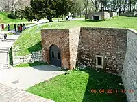 The explored sections after 2000 include the access downhill path to the Small Staircase in Kalemegdan Park, the bastion on the Sava slope, the gates of King, Sava, Dark and Karađorđe, the Great Ravelin, etc.[7] During the 2017 reconstruction of the Mehmed Paša Sokolović's Fountain, next to Defterdar's Gate in the Gornji Grad, several archaeological discoveries were made. Remnants of the Roman castrum, two urns from the Bronze Age and remains of the Neolithic object were discovered. The findings were conserved and reburied.[49]