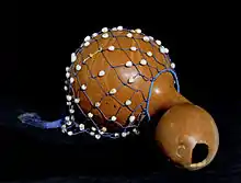 The axatse (Ghanaian beaded gourd instrument) part which typically accompanies the 12-pulse standard pattern in Ewe music is verbalized as: "pa ti pa pa ti pa ti pa ti pa pa". The "pa"s sound the standard pattern by striking the gourd against the knee. The "ti"s sound pulses in between the bell strokes, by raising the gourd in an upward motion and striking it with the free hand. As is common with many African rhythms, the axatse part begins (first "pa") on the second stroke of the bell (1a), and the last "pa" coincides with 1. By ending at the beginning of the cycle, the axatse part contributes to the cyclic nature of the overall rhythm. See: standard bell with accompanying axatse part. Atsiagbekor.