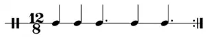 Key patterns are generated through cross-rhythm.[13] They typically consist of 12 or 16 pulses, and have a bipartite structure, which evenly divides the pattern into two rhythmically opposed cells of 6 or 8 pulses each.[14] The key pattern defines the musical period; the first cell is antecedent, and the second is consequent.[15][16] The asymmetrical array of attack-points contradicts the metrical symmetry of the two cells.[17]