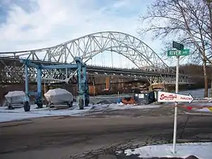 Trolley services were disrupted when a girder for the new bridge fell, severing the wires in 1951.[2] Several people were injured by flying debris when one of the supports for the previous bridge was demolished by blasting in 1955.[3]