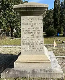 Tillman had met, in 1886, with Thomas G. Clemson, son-in-law of the late John C. Calhoun, to discuss a bequest to underwrite the cost of the new agricultural school. Clemson died in 1888, and his will not only left money and land for the college, but made Tillman one of seven trustees for life, who had the power to appoint their successors. Tillman stated that this provision, which made the lifetime trustees a majority of the board, was intended to forestall any attempt by a future Republican government to admit African Americans.[55] Clemson College (later Clemson University) was authorized by the legislature in December 1888.[56]