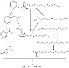 Benzalkonium chloride degradation follows consecutive debenzylation, dealkylation, and demethylation steps producing benzyl chloride, an alkyl dimethyl amine, dimethylamine, a long chain alkane, and ammonia.[50] The intermediates, major, and minor products can then be broken down into CO2, H2O, NH3, and Cl–. The first step to the biodegradation of BAC is the fission or splitting of the alkyl chain from the quaternary nitrogen as shown in the diagram. This is done by abstracting the hydrogen from the alkyl chain by using a hydroxyl radical leading to a carbon centered radical. This results in dimethylbenzylamine as the first intermediate and dodecanal as the major product.[50]