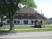 Berne's national reputation for furniture manufacturing began with Leander Dunbar (1850-1934), a native of the Linn Grove area of Adams County. By 1882 Dunbar had left his father's farm to be a wagon and buggy-maker in Linn Grove. Following the invention of the automobile and Henry Ford's assembly line, Dunbar saw the writing on the wall and transitioned into furniture making (by 1916).[27] Finally, in April 1919 the "Dunbar Furniture Manufacturing Company" was incorporated with a capital investment of $25,000 and Leander Dunbar and Homer Niederhauser (1886-1973) - also a Linn Grove native - as directors.[28] It consisted of 23 employees working in a single room factory, with sales of $8,000 that first year.[29] Within a few months (October 1919), Dunbar moved its headquarters to Berne to take advantage of its railroad line and highways. Within seven years (1926), Dunbar was operating a 36,000 sq. ft. facility with sales of $1.5 million - the largest upholstery plant in Indiana and the 4th largest in output in the country.[29]