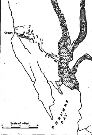 Berners Bay, Point Bridget, and Point St. Marys were named by George Vancouver during his 1790s expedition to chart the Alaskan coastline; his mother's maiden name was Bridget Berners and she was born in St. Mary's Wiggenhall.[1] Berners Bay was traditionally the place of Wooshkeetaan Auke people who collected blueberries, huckleberries, and nagoonberries at the bay.[2] Auke smokehouses and a village existed near the bay and another village, Kutegan, was situated upstream at the confluence of the Lace River. The bay was used throughout the year by Auke for fishing operations, but is now deserted.[2] The Clinton administration declared it as an Aquatic Resource of National Importance.[3]