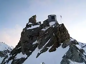 The Bertol Hut (French: Cabane de Bertol) is a mountain hut overlooking the Bertol Pass, south of Arolla in the Swiss canton of Valais. It is known for its precarious position on a ridge at 3,311 metres (10,863 ft) south of the Pointe de Bertol and is accessed by a number of fixed ladders and chains from the glacier pass (3,268 m). All accesses to the hut involve glacier crossing. On its east side it overlooks the large plateau of the Mont Miné Glacier.