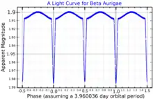 Beta Aurigae is a binary star system, but it appears as a single star in the night sky. The two stars are metallic-lined subgiant stars belonging to the A-type stellar classification;[3] they have roughly the same mass and radius. A-type entities are hot stars that release a blue-white hued light; these two stars burn brighter and with more heat than the Sun, which is a G2-type main sequence star. The pair constitute an eclipsing spectroscopic binary; the combined apparent magnitude varies over a period of 3.96 days between +1.89 and +1.94, as every 47.5 hours one of the stars partially eclipses the other from Earth's perspective.[16] The two stars are designated Aa and Ab in modern catalogues,[17][18] but have also been referred to as components 1 and 2 or A and B.[7][8]