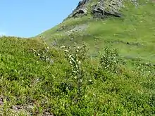 Downy birch extends farther north into the Arctic than any other broadleaf tree. Specimens of the subarctic populations are usually small and very contorted, and are often distinguished as arctic downy birch or mountain birch, B. p. var. pumila.[8][9] (not to be confused with B. nana). This variety is notable as being one of very few trees native to Iceland and Greenland, and is the only tree to form woodland in Iceland. At one time the island is thought to have been covered in downy birch woodland, but that cover is reduced to about one percent of the land surface today.[5]
