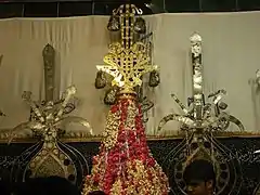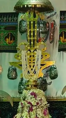 Bibi-Ka-Alam or Bibi-Ka-Alawa is an annual procession during Muharram. Bibi-ka-Alam, installed in the name of Imam Hussain, grandson of Muhammad and son of Ali ibn Abi Talib and Muhammad's daughter Fatimah, at the Bibi ka Alawa at Dabirpura,[1] Old City (Hyderabad, India) on the 10th day following Moharram.[28][29][30][2] It is a Shia event. The procession starts at Alawa-e-bibi situated at Dabirpura and ends at Chaderghat. During the procession the devotees mourn the death by reciting Nauhey, (narrating the incidents occurred during 10th Moharram 61 Hijri in Karbala). The daughter of Mohammed, Fatima-e-Zehra, is called Bibi. The locality is known as Mohalla Bibi Ka Alawa.[3]