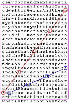 In some cases, multiple terms may be derived from an 'ELS letter array' (text in a grid, with the same number of letters in each line). In the example provided, part of the King James Version's rendering of Genesis (26:5–10) is shown with 21 letters per line, showing ELSs for "Bible" and "code".[4]