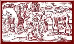 Bicorn and Chichevache are fabulous beasts that appear in European satirical works of the Middle Ages and Renaissance. Bicorn is a creature—often described as a part-panther, part-cow creature with a human-like face[1]—that devours kind-hearted and devoted husbands and (because of their abundance) is plump and well fed. Chichevache, on the other hand, devours obedient wives and (because of their scarcity) is thin and starving.