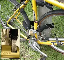 A U-lock is a rigid metal ring in the shape of the letter U. The U part of the lock attaches to a crossbar section, and for this reason they are also called D-locks. To lock the bicycle, one locks it physically to some other object, such as a bike rack, parking meter or other pole installed securely in the solid ground. Merely locking the bike frame to the wheel is not recommended because, although it cannot be rolled away, the entire bicycle can still be lifted and carried away.[1]