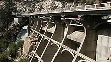 In 1884 marshy, nearly flat Bear Valley was dammed with a single arch granite impoundment, which held back some 25,000 acre-feet (31,000 dam3) of water for irrigation purposes in the Redlands area. Redlands citrus growers found that the 1884 dam produced insufficient water. The Bear Valley Mutual Water Company (successor to Bear Valley Irrigation Company) hired John S. Eastwood to design a new dam.[4] In 1912 a 72 ft (22 m) multiple arch dam was constructed about 300 ft (91 m) downstream of the old dam and increased the lake capacity to 73,000 acre-feet (90,000 dam3). The original granite dam still remains, usually under about 20 feet of water. A highway bridge (SR 18) was built over the arches of the new dam in 1923. A new bypass bridge was built next to the old bridge in 2009, and the old bridge on top of the new dam was removed (12). Elevation at the surface is 6,750 ft (2,060 m), but this level fluctuates according to annual snowmelt and runoff. Big Bear Municipal Water District acquired the dam and other assets from the Mutual Water Company in 1977.[5]
