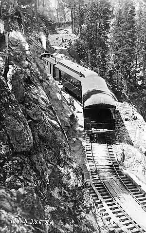 Construction of the railroad began on February 5, 1912.[19] Winding its way up the San Joaquin River Canyon, the railroad – featuring 1,078 curves, 43 bridges and 255 grades of up to 5.2 percent[20] – was nicknamed the "Slow, Jerky and Expensive". The final mile (1.6 km) was known as the "Miracle Mile" because it reportedly cost over $1 million to construct. The railroad was completed by July 1912, in a record 157 days. Due to its steep grades and sharp curves (up to 60 degrees) it was serviced by geared Shay locomotives, built by the Ohio Lima Locomotive Works.[21][22]