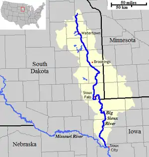 The Big Sioux River is a tributary of the Missouri River in eastern South Dakota and northwestern Iowa in the United States.[2] It flows generally southwardly for 419 mi (674 km),[3] and its watershed is 9,006 sq mi (23,330 km2).[1] The United States Board on Geographic Names settled on "Big Sioux River" as the stream's name in 1931.[4] The river was named after the Lakota people (Sioux Natives)[5] which was known by them as Tehankasandata, or Thick Wooded River.[6]