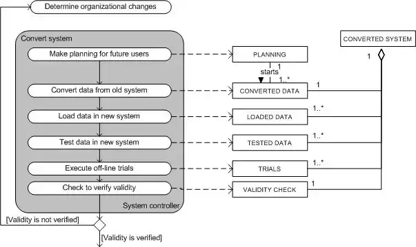 If all the data is valid, separate parts of the system can be released. The database which is converted from the old database needs to be released, so the new data is accessible. Next, the produced application needs to be released, so the new application can also be used. The infrastructure of the whole new system also needs to be released, so that it is clear what the system will look like and how everything is connected (Koop, Rooimans and de Theye, 2003). In this phase only separate parts are released, which don't form the new system yet, but only parts of it. All of this happens off-line: only the system developers see this, while the users are still working on the old system. The model above shows what activities need to be executed (in the grey box) by the system controller, to get the outcomes that lead to the released parts. If the release of the parts failed, the management need to determine new changes again (See Adoption; Prepare an organization for adoption).