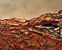When lava next flowed over it, the heat and pressure transformed the muddy mixture. As water escaped it in the form of superheated steam, pressure variations resulted in flexing and many short fluctuating changes, reflected in the jasper's many thin, parallel bands.[1]: 58 The hydrothermal reaction progressed as a shock wave through the mud, removing iron from it and depositing the iron as intertwining bands of limonite. The altered rock remained plastic, and subject to local movement as a result of pressure changes. These caused the great variety of marbled, rosette-like and picture designs found in Biggs jasper.[1]: 59