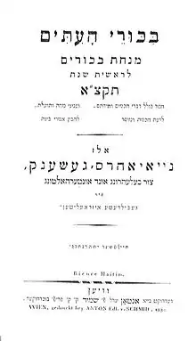 Bikkure ha-Ittim (Hebrew: בִּכּוּרֵי הָעִתִּים, lit. 'First-Fruits of the Times') was a Hebrew-language annual published in Vienna from 1820 to 1831. Founded by Salomon Jacob Cohen, it was adopted by the Galician Maskilim as their means to promote culture and education among Galician Jews. The publication was a forerunner of modern Hebrew journalism and played a significant role in the revival of the Hebrew language.[2]