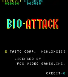 Bio-Attack (バイォ・ア夕ツク) is a vertically scrolling shooter arcade video game released by Taito in 1983. The player controls a miniaturized ship moving through a human's body while shooting viruses. It was licensed by Fox Video Games, as it is based on the 20th Century Fox film Fantastic Voyage.