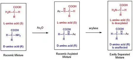 Biocatalyzed kinetic resolution is utilized extensively in the purification of racemic mixtures of synthetic amino acids. Many popular amino acid synthesis routes, such as the Strecker Synthesis, result in a mixture of R and S enantiomers. This mixture can be purified by (I) acylating the amine using an anhydride and then (II) selectively deacylating only the L enantiomer using hog kidney acylase.[6] These enzymes are typically extremely selective for one enantiomer leading to very large differences in rate, allowing for selective deacylation.[7] Finally the two products are now separable by classical techniques, such as chromatography.
