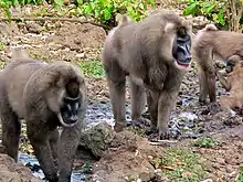 The diet of the Bioko drill is largely dependent on their location on the island, with lowland drills primarily consuming a frugivorous diet, similar to the mainland drill, whereas drills living in more mountainous areas preferably feed on herbaceous materials such as pith, leaves and fungi, though these are significantly less nutritious.[10][9] Those higher altitude drills consume a greater range of components, including the pith, stalk, flowers, seeds, leaves, and roots of a plant, rather than just the fruits.[10] They are also capable of husking coconuts to consume them.[6] The drill diet may also consist of wood and mushrooms, the latter of which is rare in a primate.[10] Bioko drills are also known to consume animals, including most commonly; beetles, land crabs and other crustaceans, millipedes and hymenopterans, a class that includes ants, flies, wasps,[10] and the African giant snail.[6] In one instance, the remains of rodents and frogs were found in faecal matter of a drill,[10] and they have also been noted to forage for marine turtle eggs on beaches.[6] Additionally, the drill's response to distress calls of duikers may be indicative of their willingness to consume them.[6]