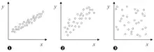 Using X and Y as variables, the first graph shows a very high correlation, the middle graph shows a fair correlation, and the third shows no/little correlation.