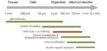 Biological small-angle scattering is a small-angle scattering method for structure analysis of biological materials. Small-angle scattering is used to study the structure of a variety of objects such as solutions of biological macromolecules, nanocomposites, alloys, and synthetic polymers.[1] Small-angle X-ray scattering (SAXS) and small-angle neutron scattering (SANS) are the two complementary techniques known jointly as small-angle scattering (SAS).[2] SAS is an analogous method to X-ray and neutron diffraction, wide angle X-ray scattering, as well as to static light scattering. In contrast to other X-ray and neutron scattering methods, SAS yields information on the sizes and shapes of both crystalline and non-crystalline particles. When used to study biological materials, which are very often in aqueous solution, the scattering pattern is orientation averaged.[3][4]