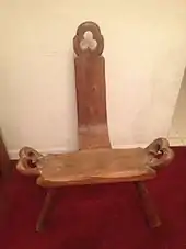 The birthing chair has been used for millennia. It appears in the Bible's observation: 'And he said, 'When ye do the office of a midwife to the Hebrew women and see them upon the birthstool' (Exodus 1:16). Birthing chairs took the place of laboring mothers sitting on birth attendant's laps, as it was the previous practice. These chairs were used before male physicians dominated the delivery room.[2] The use of the birthing chair or similar devices has been seen around the globe, not isolated to a particular region. A woman giving birth in the upright position has been seen in Asian, African, Pacific Islander, and Native American art. The birthing chair can be traced to Egypt in the year 1450 B.C.E. Pictured on the walls of The Birth House at Luxor, Egypt, is an Egyptian queen giving birth on a stool. It can also be traced to Greece in 200 B.C as it is featured on an ancient Grecian sculpted votive.[1] Celtic items from 100 B.C.E in Britain also depict women sitting in the same upright position as if in a birthing chair. The first depiction in a woodcut from the 16thc shows a woman sitting on a stool and surrounded by other women.[3] The three legged birth stool, sometimes called a groaning stool, was designed to be carried disassembled, and sits low to the ground. Some examples, such as this continental birthing chair, are adjustable with the back extending so the woman could move from an upright position to a reclined position.[4]