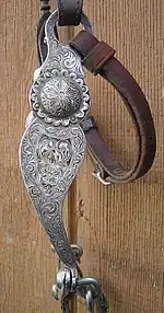 The bit shank is the side piece or cheekpiece of a curb bit, part of the bridle, used when riding on horses. The bit shank allows leverage to be added to the pressure of the rider's hands on the bit. Shanks are usually made of metal, may be straight or curved, and may be decorated in some disciplines. The headstall and curb chain or curb strap of the bridle is attached to the top of the shank, and the reins are attached at the bottom. Shanked curb bits are used in western riding for nearly all adult horses, and are seen in English riding disciplines primarily as part of the double bridle used by advanced dressage riders, and on the hybrid pelham bit that includes a ring for a second rein attached at the bit mouthpiece.