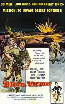 Bitter Victory (French title Amère victoire) is a 1957 Franco-American international co-production film, shot in CinemaScope and directed by Nicholas Ray. Set in World War II, it stars Richard Burton and Curt Jürgens as two British Army officers sent out on a commando raid in North Africa. Ruth Roman plays the former lover of one and the wife of the other. It is based on the novel of the same name by René Hardy.