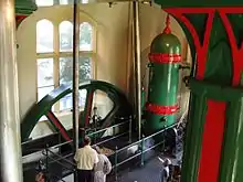 When the lake first opened there were four Woolf compound rotative beam pumping engines, housed in two separate buildings. They were built by Glenfield & Kennedy of Kilmarnock between 1900 and 1905. The engine's beam is 34 ft (10.36 m) long and weighs 17 tons. The flywheel is 20 ft (6.10 m) in diameter and weighs 20 tons,[4] having a crank throw of 3.5 ft (1.07 m). Each beam engine had an output of 170 horsepower (130 kW) at 17 rpm. The high-pressure cylinders, 21 inches (53.3 cm) in diameter and with a 3.25 ft (0.99 m) stroke, were supplied by steam from horizontal Lancashire-type twin flue boilers with Green's economisers at 100 pounds per square inch (6.9 bar). The low-pressure cylinder was 34 inches (86.4 cm) in diameter and has a 7 ft (2.13 m) stroke. Three engines with a fourth on standby could pump water at a rate of 7.5 million imperial gallons (34,000 m3) per day, whilst the boilers consumed 8.5 tons of coal per day. A mechanical efficiency of 90% was claimed, the 30-inch (76.2 cm) diameter pump bucket, 3.5 ft (1.07 m) strike and plunger diameter of 21 inches (53.34 cm) gave a pump output of 107 imperial gallons (490 L) per stroke. They ran until 1949, when two engines from the north engine house were replaced by electric pumps.[12] In 1950 automatic shutdown equipment was installed to prevent damage in the event of a burst main or overloading of the new electric pumps. This meant that it was no longer essential to have staff on site 24 hours a day.[13] The decorative chimney was shortened in the 1960s.[2] In 2014 new split-case vertical pumps and various other new equipment was installed to replace those installed in the 1940s and 1950s.[14]