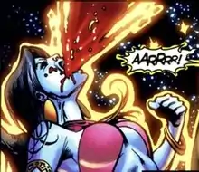 In the aftermath of the War of the Green Lanterns and the death of the rogue Guardian Krona, Atrocitus felt his rage dimming, and feared that he might be losing control of his Corps.[10] He decided to uplift one of his Red Lanterns, making them almost his equal. He chose Bleez as his new second-in-command, and hurled her into the Blood Ocean to restore her intellect and memories. After she emerged from the ocean, he took her back to her home planet of Havania, where she confronted Count Liib and Baron Ghazz, the men who had been responsible for her kidnapping and torture by the Sinestro Corps. After killing Ghazz, she and Atrocitus disagreed over Liib's fate. Bleez wanted to leave him alive and hunt him down later, but Atrocitus, uninterested in her 'subtleties', simply killed him outright.[11] Despite this initial clash, events seemed to progress smoothly. Bleez was able to regain some measure of control over the Red Lanterns, but Atrocitus came to believe that she was manipulating the Corps for her own ends. When Atrocitus decided to immerse three more Red Lanterns in the Blood Ocean to keep Bleez in check, she attempted to dissuade him, noting that the trauma of regaining their memories might drive them insane.[12] After Krona's body disappeared from Ysmault, Atrocitus attacked Bleez, believing her to be responsible. She held her own against him, causing the other Red Lanterns to realize that Atrocitus was losing his rage and his focus.[13] Bleez subsequently seized control of the Corps, leading them on a galaxy-wide hunt for Sinestro, whom she held ultimately responsible for her condition.[14]