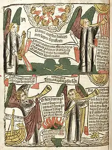 A 1991 census of surviving copies of block books identifies 43 different "titles" (some of which may include different texts).[12] However, a small number of texts were very popular and together account for the great majority of surviving copies of block books. These texts were reprinted many times, often using new woodcuts copying the earlier versions. It is generally accepted that the Apocalypse was the earliest block book, one edition of which Allan H. Stevenson dates to c. 1450–52.[13][14] The following is a partial list of texts, with some links to digitized on line copies:[15]
