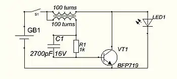 A blocking oscillator (sometimes called a pulse oscillator) is a simple configuration of discrete electronic components which can produce a free-running signal, requiring only a resistor, a transformer, and one amplifying element such as a transistor or vacuum tube. The name is derived from the fact that the amplifying element is cut-off or "blocked" for most of the duty cycle, producing periodic pulses on the principle of a relaxation oscillator. The non-sinusoidal output is not suitable for use as a radio-frequency local oscillator, but it can serve as a timing generator, to power lights, LEDs, Elwire, or small neon indicators. If the output is used as an audio signal, the simple tones are also sufficient for applications such as alarms or a Morse code practice device. Some cameras use a blocking oscillator to strobe the flash prior to a shot to reduce the red-eye effect.