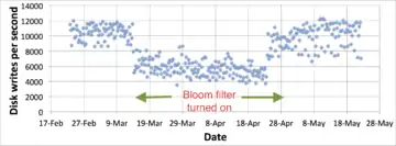 Using a Bloom filter to prevent one-hit-wonders from being stored in a web cache decreased the rate of disk writes by nearly one half, reducing the load on the disks and potentially increasing disk performance.[12]