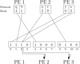 Distributed Bloom filters are initiated by first hashing all elements on their local PE and then sorting them by their hashes locally. This can be done in linear time using e.g. Bucket sort and also allows local duplicate detection. The sorting is used to group the hashes with their assigned PE as separator to create a Bloom filter for each group. After encoding these Bloom filters using e.g. Golomb coding each bloom filter is sent as packet to the PE responsible for the hash values that where inserted into it. A PE p is responsible for all hashes between the values and , where s is the total size of the Bloom filter over all data. Because each element is only hashed once and therefore only a single bit is set, to check if an element was inserted into the Bloom filter only the PE responsible for the hash value of the element needs to be operated on. Single insertion operations can also be done efficiently because the Bloom filter of only one PE has to be changed, compared to Replicating Bloom filters where every PE would have to update its Bloom filter. By distributing the global Bloom filter over all PEs instead of storing it separately on each PE the Bloom filters size can be far larger, resulting in a larger capacity and lower false positive rate.