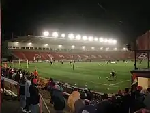 In 1925, a new South Stand was built to provide a new boardroom, offices, dressing rooms, baths and refreshment bars. It cost just over £13,000 and held 4,000 people, bringing the total ground capacity to well over 20,000.[8] Also this year, a new directors' box was built in the North-West Corner of the ground. It was used for the first time for the visit of Southampton on 29 August 1925. Ernest Lawson commented in the Gazette & Herald: "It's a nice box they have placed themselves in; it must be for safety, for it is far enough out of the way! But of what are they frightened?" He offered an answer at a later date: "The Let Me Smoke railway stokers are a choking nuisance. Now we know from what the directors are protecting themselves." He was referring to the smoke that regularly drifted in at the north-west corner of the ground, caused by steam trains passing by. Lawson added: "The crowd do, however, have the last laugh when the wind comes in from the east!"[5]