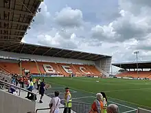 Also in 1906, a 2,000-capacity stand was constructed on the north side of the ground. Named the Motor Stand and made Bloomfield Road one of the only grounds in England to have stands on all four sides of the ground. Partly erected, it was opened for the first time on 10 November for the visit of West Bromwich Albion.[5] The club organist a whist drive at the Conservative Club to help defray the expense. The stand was borrowed from the Blackpool Corporation and practically filled the north side of the ground. It was purchased from the council in June 1908 at a cost of £100.[5]