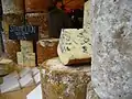 Roquefort blue cheese originates from the village of Roquefort-sur-Soulzon, France.[28] Its flavors come from the use of unpasteurized sheep's milk, inoculation with Penicillium roqueforti, and the special conditions of the natural caves of Roquefort-sur-Soulzon in which they are ripened.[28] Penicillium roqueforti is the cause of the blue veins in Roquefort cheese. In addition to Penicillium roqueforti, various yeasts are present, namely Debaryomyces hansenii and its non-sporulating form Candida famata, and Kluyveromyces lactis and its non-sporulating form Candida sphaerica.[35] Similarly to other kinds of blue cheeses, Roquefort's flavor and odor can be attributed to the particular mixture of methyl ketones such as 2-heptanone, 2-pentanone, and 2-nonanone.[16]