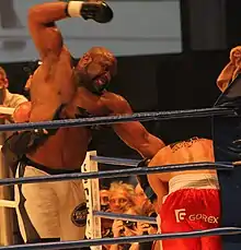 His greatest in-ring success, though, would come in his match over K-1 legend Ernesto Hoost. They first met at the K-1 World Grand Prix 2002 Final Elimination on October 5, 2002, where Sapp replaced an injured Cro Cop in his bout against Hoost.[33] The latter was expected to win thanks to his experience and technical superiority despite being outweighed by over 100 pounds, but Sapp claimed he would not need more than the first round to defeat Hoost, thus setting up an anticipated matchup.[11] Once the fight came around, all while under a television viewership of 19.8%,[11] Sapp surprised the crowd when he started dominating Hoost effectively through his already known charging strategy. By pushing Hoost against the ring's corners and unloading punches there with all of his strength, Sapp controlled the entire the first round, and still landed controversially three more punches after the bell sounded.[34] After the round, the ring doctor declared Hoost was unable to continue due to cuts, and Sapp was ultimately deemed winner while Hoost collapsed visibly in his corner, fulfilling his previous prediction.[35]