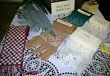 Contemporary handmade woollen bobbin lace articles, Wool Expo, Armidale NSW. Pale green lace is made of 2 ply wool.