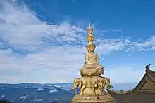 In Mahayana Buddhism, a bodhisattva refers to anyone who has generated bodhicitta, a spontaneous wish and compassionate mind to attain Buddhahood for the benefit of all sentient beings.[4] Mahayana bodhisattvas are spiritually heroic persons that work to attain awakening and are driven by a great compassion (mahākaruṇā). These beings are exemplified by important spiritual qualities such as the "four divine abodes" (brahmavihāras) of loving-kindness (maitrī), compassion (karuṇā), empathetic joy (muditā) and equanimity (upekṣā), as well as the various bodhisattva "perfections" (pāramitās) which include prajñāpāramitā ("transcendent knowledge" or "perfection of wisdom") and skillful means (upāya).[5][6][7]