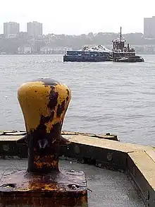 In the maritime contexts in which the term originates, a bollard is either a wooden or iron post found as a deck-fitting on a ship or boat, and used to secure ropes for towing, mooring and other purposes; or its counterpart on land, a short wooden, iron, or stone post on a quayside to which craft can be moored. The Sailor's Word-Book of 1867 defines a bollard in a more specific context as "a thick piece of wood on the head of a whale-boat, round which the harpooner gives the line a turn, in order to veer it steadily, and check the animal's velocity".[1][6] Bollards on ships, when arranged in pairs, may also be referred to as "bitts".[7][8]