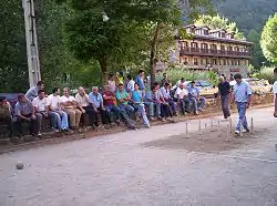 Bolo palma is a variant of bowls originated and played throughout the region of Cantabria, north of Spain. The basic aim of the game is to knock over as many pins as possible with a wooden ball. Records of the game go back as far as the 16th century.[1] The game was also spread to neighbouring areas of eastern Asturias and northern Palencia. Cantabrian emigration also took the practice of the sport elsewhere in Spain to places such as the Basque Country, Madrid, Catalonia and Andalusia and even to other countries like Mexico, Argentina, Chile and Venezuela.[1]