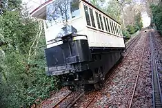 Each cabin includes two water tanks, with the largest with a capacity for 5,850 litres (1,290 imp gal) that functioned as a counterweight and supported refrigeration circuit for the brakes, and the small tank with a capacity for 216 litres (48 imp gal) that supported the rear brakes.[1][2] Both trams run is opposite directions, arriving at their opposite stops simultaneously.[1] It is the oldest funicular in the world moved by water counterbalancing, loading water into the car at the top of the hill, weighing it down so it descends to the bottom, at the same time drawing the lighter, drained car up the hill, where the process starts all over again: the trip takes between 2.4 and 4 minutes.