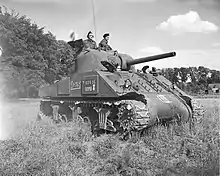 Bomb landed at Juno Beach on D-Day, June 6, 1944, with the Sherbrooke Fusilier Regiment at Bernières-sur-Mer and was almost immediately involved in fighting at Authie and Buron where the Fusiliers destroyed 41 tanks in their first two days of fighting.[6] Even more intense tank battles followed in Normandy, as German Panzer and SS units tried to crush the Allied beachhead, while the Allies sought to break out. The tank fought in the actions around Caen, including the costly fighting on Bourguébus Ridge, and the capture and clearing of the city of Falaise.[7] The tank started with the call sign 22, but in July the Fusilier tank troops were re-organized and Bomb became a troop command tank with the call sign 21 painted on the turret.[8] Following the Allied breakout, Bomb travelled 4,000 kilometres (2,500 mi) across northwestern Europe, helping to liberate northern France, Belgium and the Netherlands.
